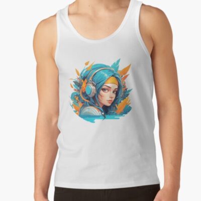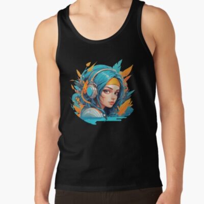 Stylish Cyberpunk Girl With Blue Hair And Headphones Tank Top